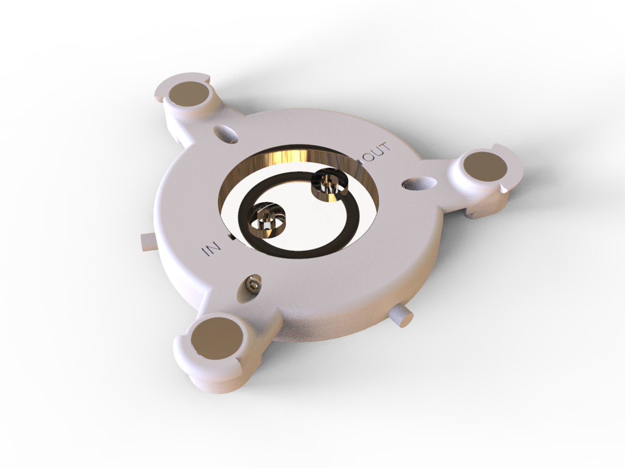 頂部 Flow 蓋由帶有集成聚四氟乙烯或有機玻璃窗口的尼龍框架組成。聚四氟乙烯窗口特別適合與腐蝕性物質(例如:溶劑)一起使用。它有 2 個管接口,以便在流體應用中使用 openQCM 設備。流量蓋還安裝了密封系統與感測器模組所需的所有組件。